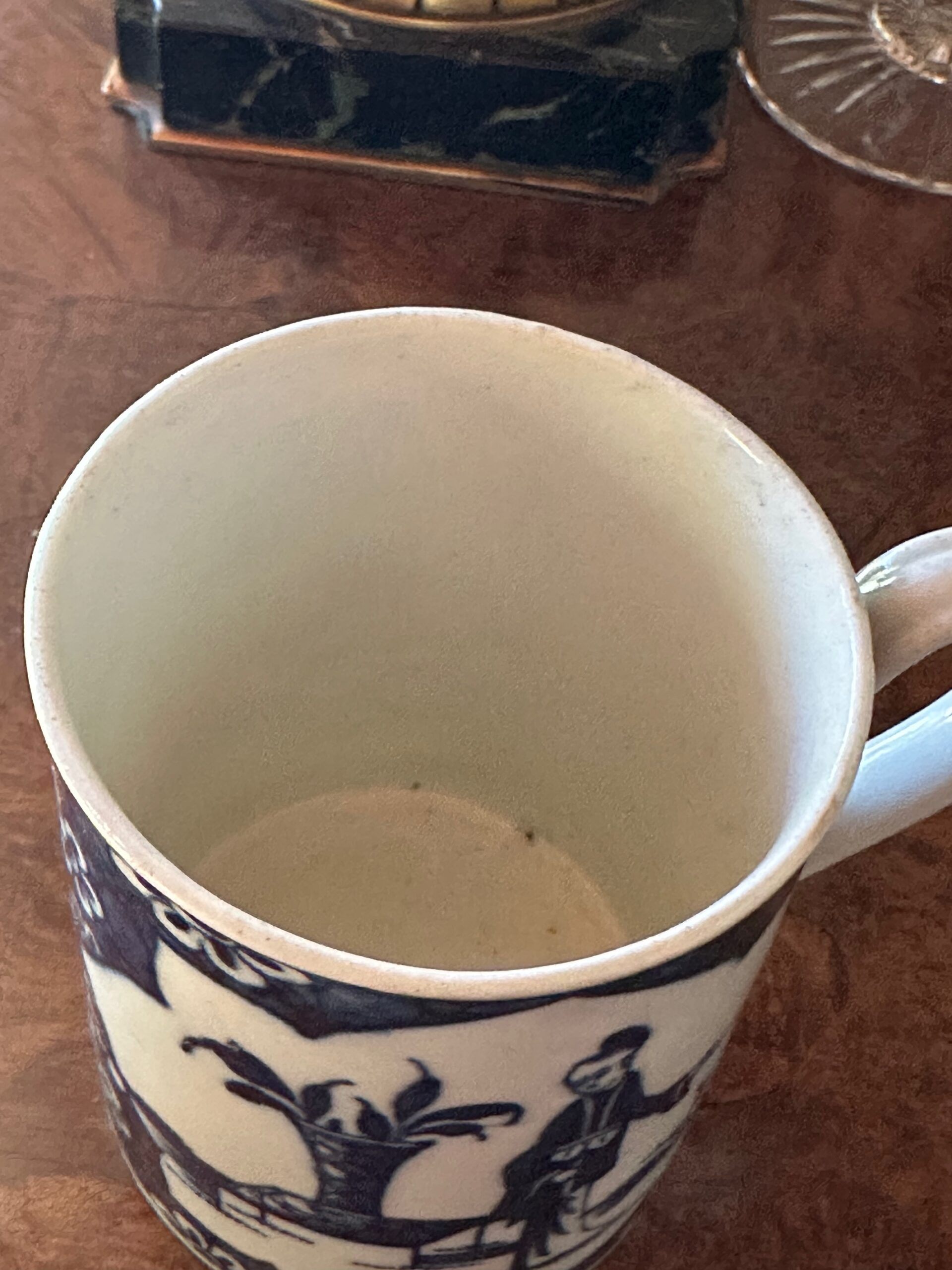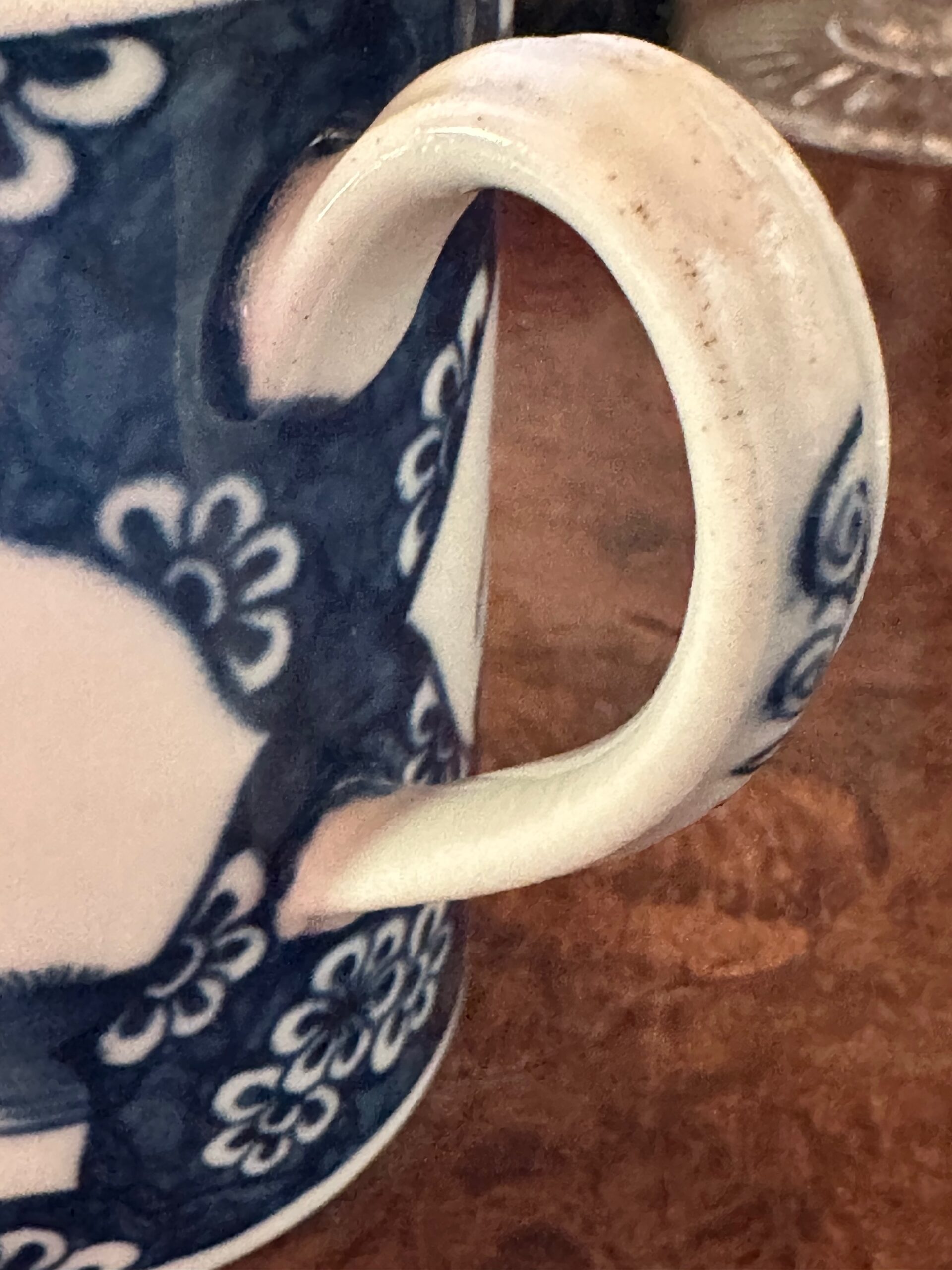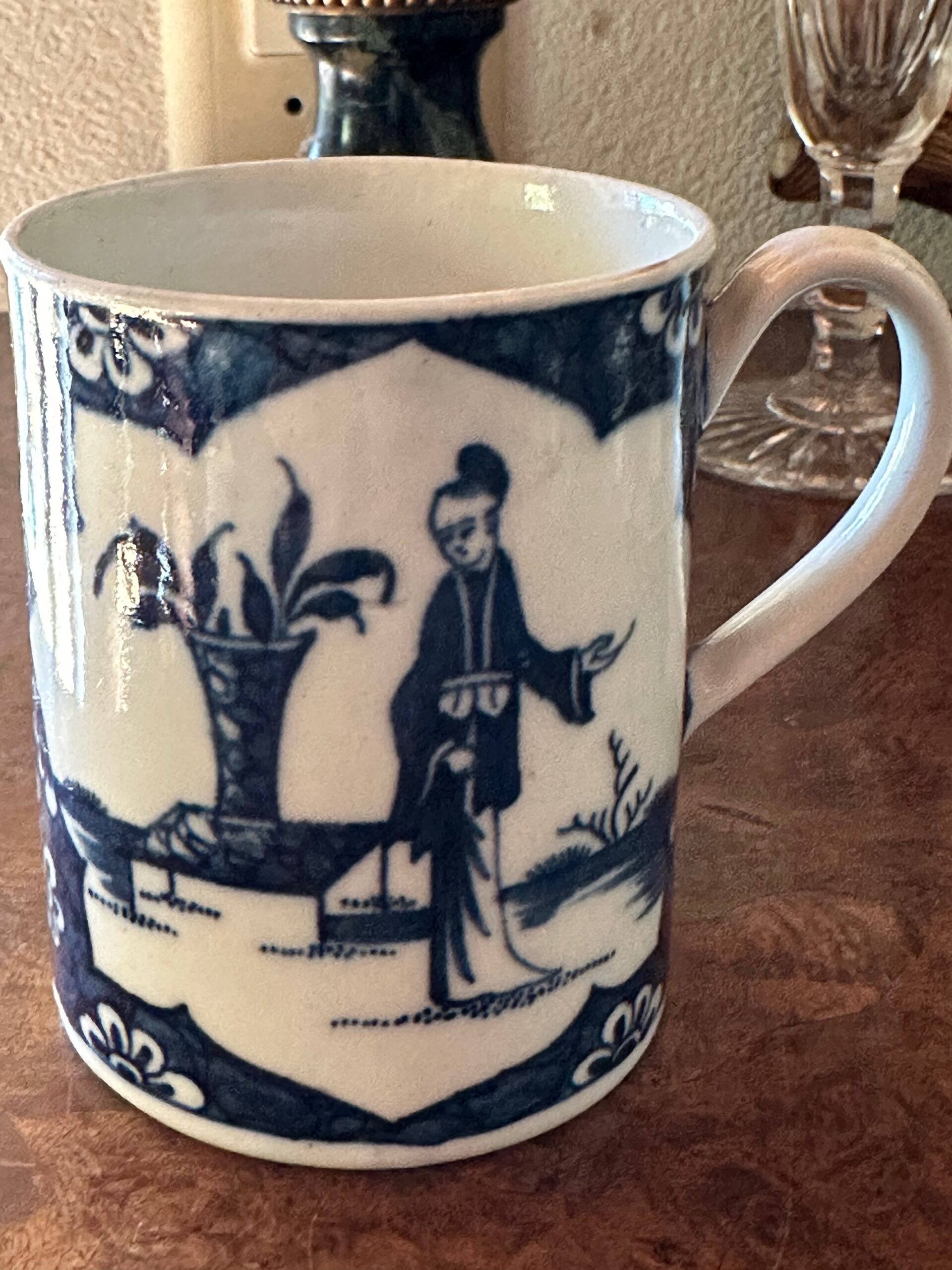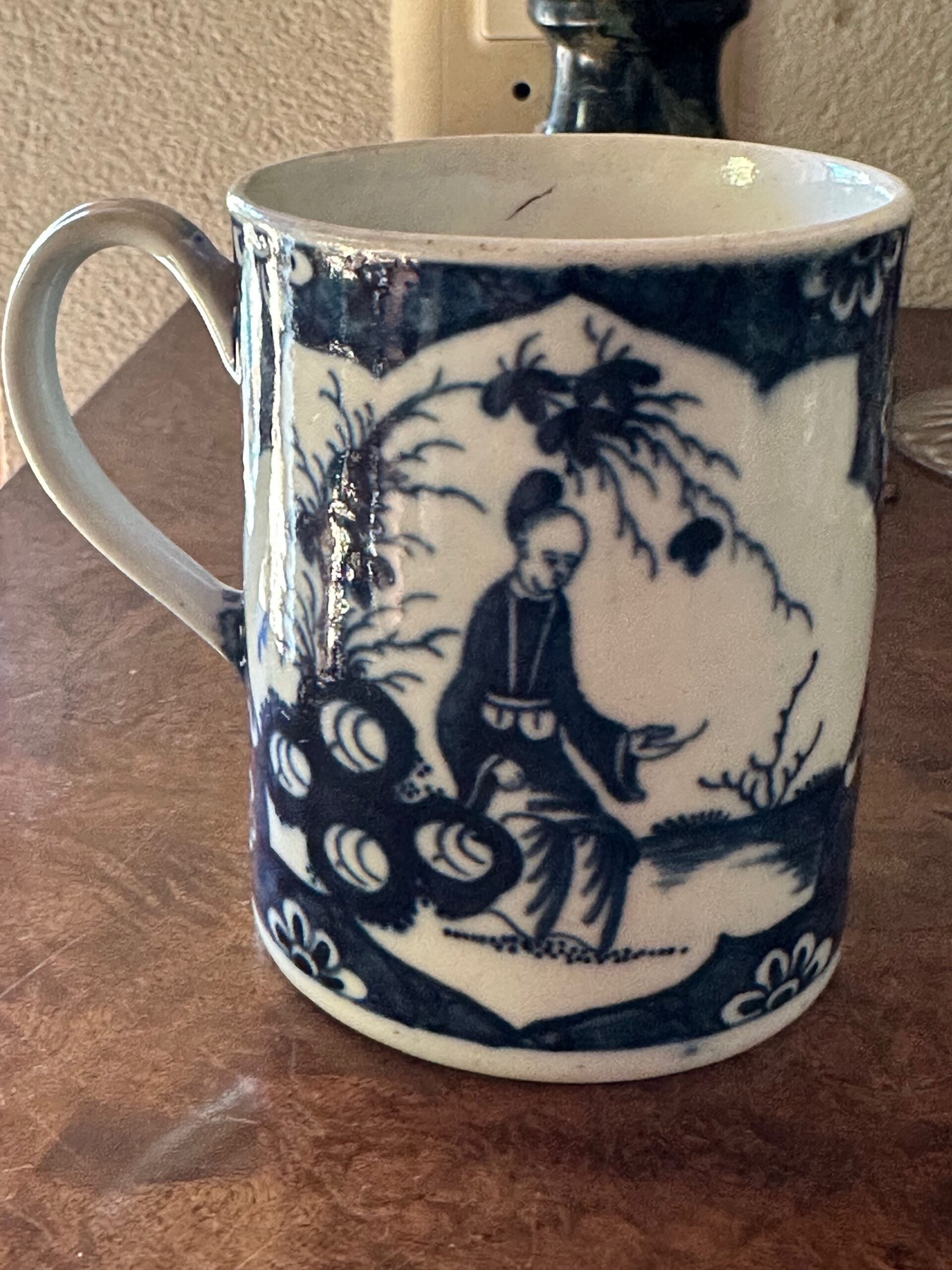 Worcester 1st period porcelain blue white mug in chinese taste with the crackeled ice pattern. Under glaze blue with a crescent moon c1765-70. These are uncommon and very light weight with a strap handle.